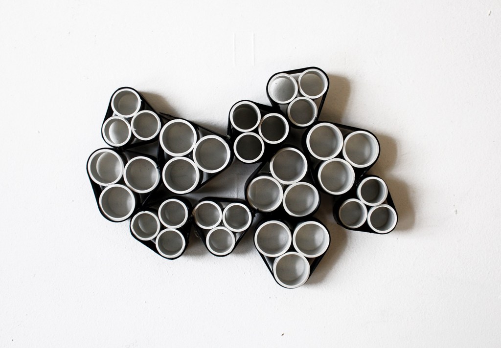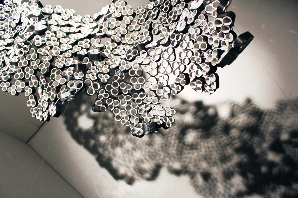 Avec comme contraintes deux matériaux : la chambre à air et les tubes en plastique PVC, nous avons imaginé des manières d’assemblages en questionnant les propriétés des matériaux.