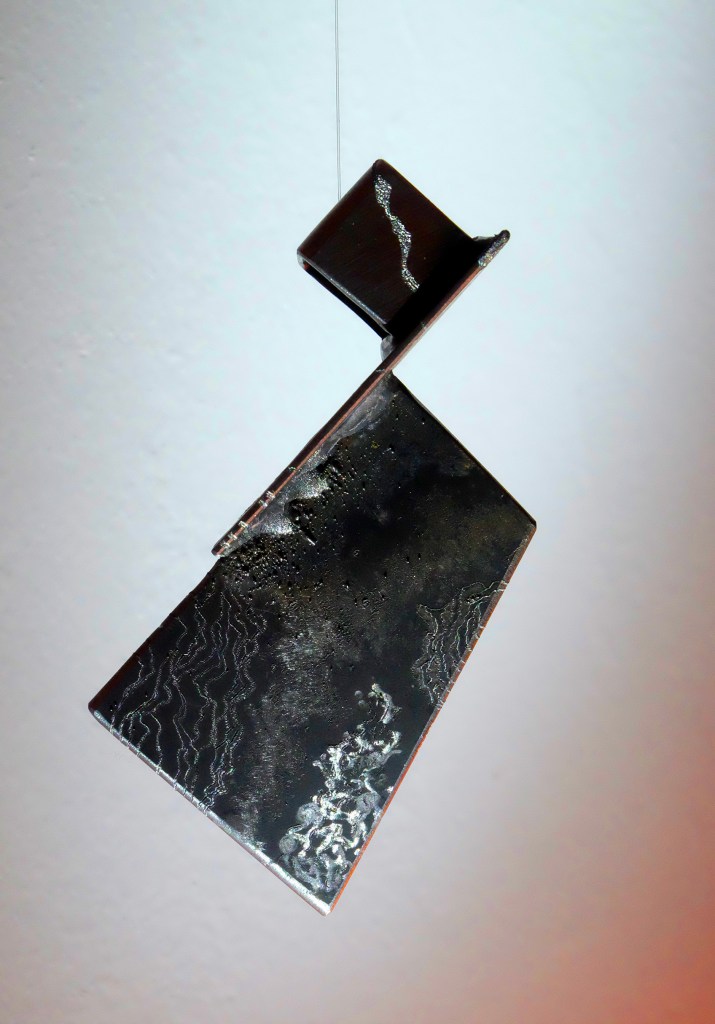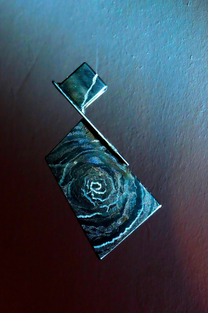 En suspension, le poids du métal semble léger, sensible à l’air, il flotte et pivote lentement autour de son axe.